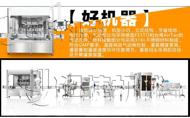 全自動(dòng)辣椒醬六頭灌裝機(jī)作為公司新研發(fā)的灌裝設(shè)備在市場(chǎng)上起到了關(guān)鍵性的作用,是集光,機(jī),電,氣于一體,采用活塞式定量原理,灌裝精度高,操作簡(jiǎn)單,維護(hù)方便,設(shè)備主要材質(zhì):采用SUS304不銹鋼制造,符合衛(wèi)生要求.灌裝過程采用亞克力透明板與外界隔離,保證灌裝的衛(wèi)生要求。灌裝采用壓力式灌裝,無需配裝高位罐,簡(jiǎn)化了安裝工序,提高了灌裝效率??蓮V泛應(yīng)用于食品、醬料行業(yè)產(chǎn)品的自動(dòng)化包裝生產(chǎn)。