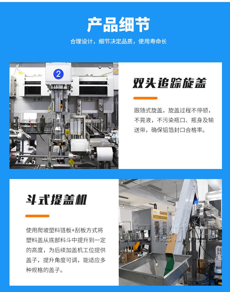 2、品質(zhì)高:跟隨式旋蓋,旋蓋過(guò)程不停頓,不晃液,不污染瓶口、瓶身及輸送帶,確