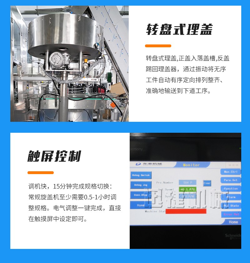 7、調(diào)機(jī)快,15分鐘完成規(guī)格切換:常規(guī)旋蓋機(jī)至少需要0.5-1小時(shí)調(diào)整規(guī)格。