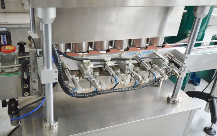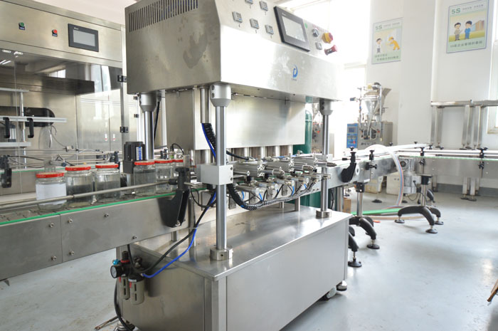 罐頭真空封蓋機(jī)用于調(diào)味品醬、水產(chǎn)罐頭、水果罐頭等采用目前環(huán)保的玻璃瓶包裝后對(duì)瓶內(nèi)真空度有比較高要求的三旋、四旋蓋的玻璃瓶進(jìn)行封蓋,本機(jī)配上真空系統(tǒng)后,能先對(duì)玻璃瓶內(nèi)進(jìn)行抽吸真空,然后再進(jìn)行旋蓋封口,以延長瓶內(nèi)容物的保質(zhì)期及增強(qiáng)口感,而且不用加熱以保持物料色澤不變。實(shí)行自動(dòng)進(jìn)瓶、自動(dòng)封蓋、自動(dòng)進(jìn)行抽真空。