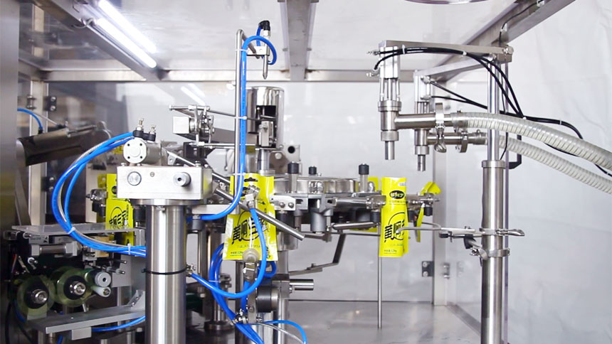 這套全自動給袋式液體醬體包裝機(jī)主要適用于液體/醬體類:洗滌劑、黃酒、醬油、米醋、果汁、飲料、番茄醬、花生醬、果醬、辣椒醬