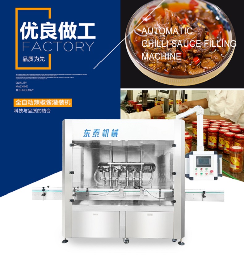 辣椒醬灌裝機(jī),顧名思義,就是用來(lái)灌裝辣椒醬的機(jī)械化設(shè)備。辣椒醬灌裝機(jī)作為迅捷公司研發(fā)的灌裝設(shè)備在市場(chǎng)上起到了關(guān)鍵性的作用,獨(dú)特的技術(shù)讓整個(gè)包裝市場(chǎng)變得富有生命力,辣椒醬灌裝機(jī)是集光,機(jī),電,氣于一體,采用活塞式定量原理,灌裝精度高,操作簡(jiǎn)單,維護(hù)方便,設(shè)備主要材質(zhì):采用SUS304不銹鋼制造,符合衛(wèi)生要求.灌裝過(guò)程采用亞克力透明板與外界隔離,保證灌裝的衛(wèi)生要求。灌裝采用壓力式灌裝,無(wú)需配裝高位罐,簡(jiǎn)化了安裝工序,提高了灌裝效率??蓮V泛應(yīng)用于食品、辣椒醬等醬料行業(yè)產(chǎn)品的自動(dòng)化包裝生產(chǎn)。