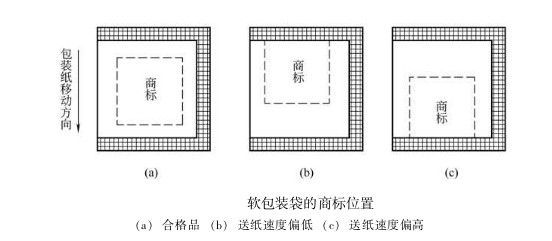 在包裝作業(yè)過(guò)程中,卷筒半徑逐漸減小,包裝紙所受張力發(fā)生變化,送紙輥與包裝紙之間的摩擦因數(shù)受環(huán)境溫濕度的影響而發(fā)生波動(dòng),加上商標(biāo)印刷誤差,以及送紙、縱封、橫封、切斷各部分速度的差異等因素,使得刀輥的實(shí)際切線偏離規(guī)定部位。即使這種位置誤差很小,例如在某—包裝袋上只偏差0.1mm,但包裝機(jī)速度很快,有的高達(dá)200包/min, 如不加以控制調(diào)節(jié),機(jī)器運(yùn)行1垃i六 后,誤差積累可達(dá)20mm,切線嚴(yán)重偏離規(guī)定部位,降低了包裝質(zhì)量,甚至造成廢品。如圖所示,圖(a)為合格品; 圖 (b) 為送紙速度偏低,商標(biāo)后移; 圖 (c) 為送紙速度偏高, 商標(biāo)前移。 為了保證包裝袋的正確封切, 必須在卷筒紙供送系統(tǒng)中, 引人商標(biāo)圖案自動(dòng)位置檢測(cè)與控制系統(tǒng)。目前應(yīng)用廣泛的是光電自動(dòng)定位系統(tǒng)。